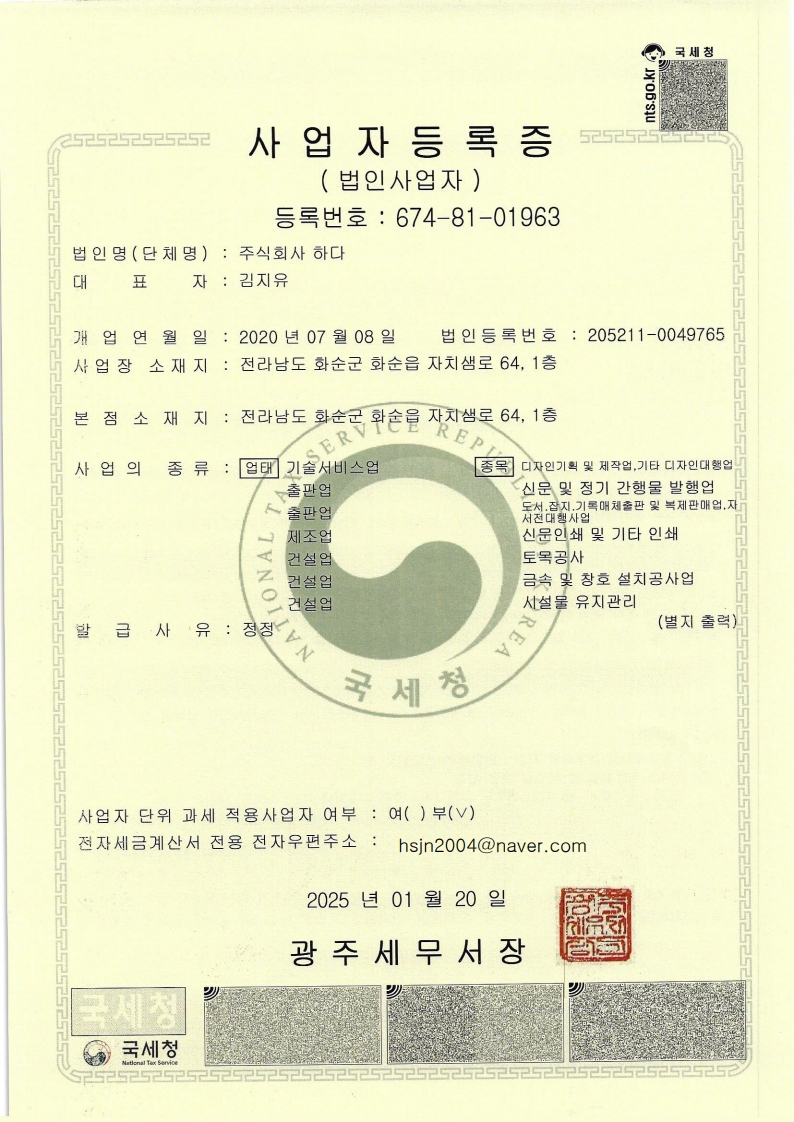사업자등록증 페이지 정보 작성자 관리자 댓글 댓글 0건 조회Hit 23회 작성일Date 25-08-26 20:30 본문 사업자등록증 페이스북 공유 트위터 공유 목록 이전글비디오물제작업신고증 25.08.26 다음글여성기업 확인서 25.08.26 댓글 0 댓글목록 등록된 댓글이 없습니다.