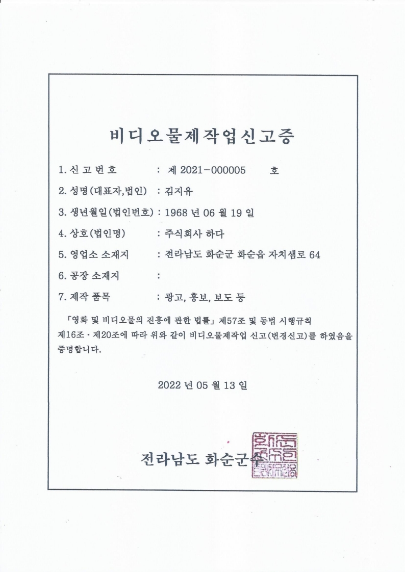 비디오물제작업신고증 페이지 정보 작성자 관리자 댓글 댓글 0건 조회Hit 21회 작성일Date 25-08-26 20:30 본문 비디오물제작업신고증 페이스북 공유 트위터 공유 목록 이전글GJ저널망치 인터넷신문 등록증 25.08.26 다음글사업자등록증 25.08.26 댓글 0 댓글목록 등록된 댓글이 없습니다.
