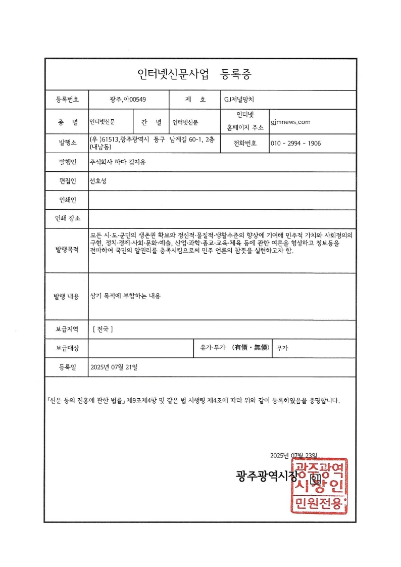 GJ저널망치 인터넷신문 등록증 페이지 정보 작성자 관리자 댓글 댓글 0건 조회Hit 24회 작성일Date 25-08-26 20:31 본문 GJ저널망치 인터넷신문 등록증 페이스북 공유 트위터 공유 목록 다음글비디오물제작업신고증 25.08.26 댓글 0 댓글목록 등록된 댓글이 없습니다.
